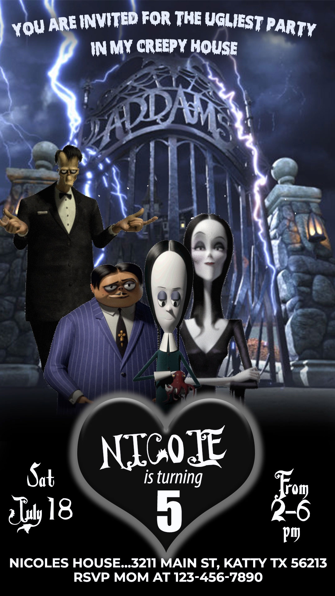 This product is for one Addams Family Birthday Video Invitation, the video will be edited with your party info and send via whatsapp or google drive.