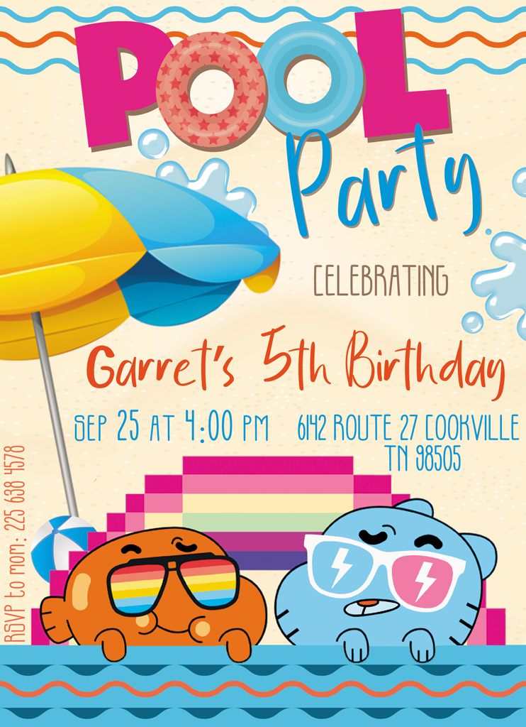 Delight your kid with this Awesome Gumball Pool Party Birthday Invitation