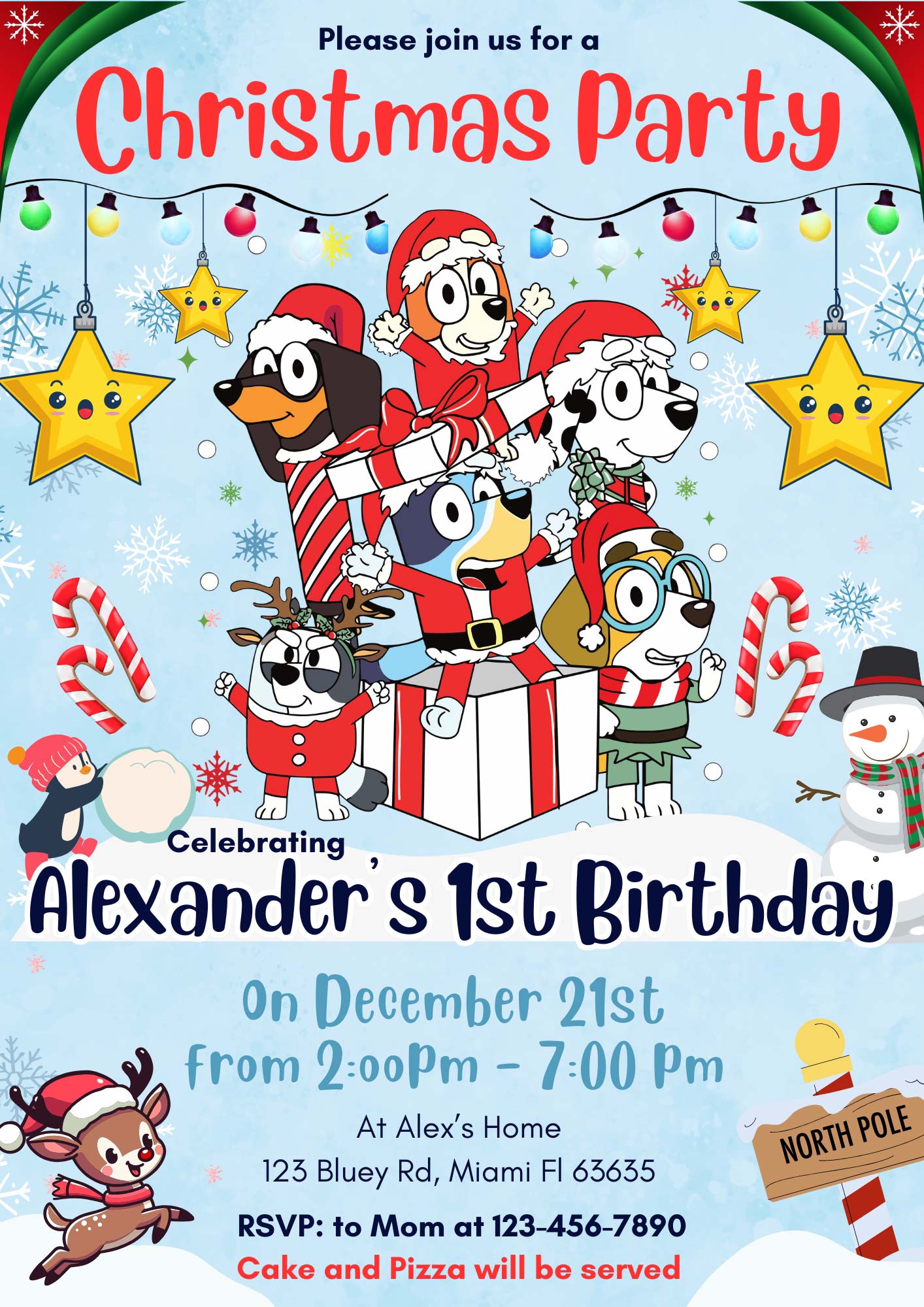 This is a digital, printable Bluey Christmas party Invitation. the invitation will be personalized by a professional designer after your purchase, using the info that you wrote at the buyers note when checking out.
