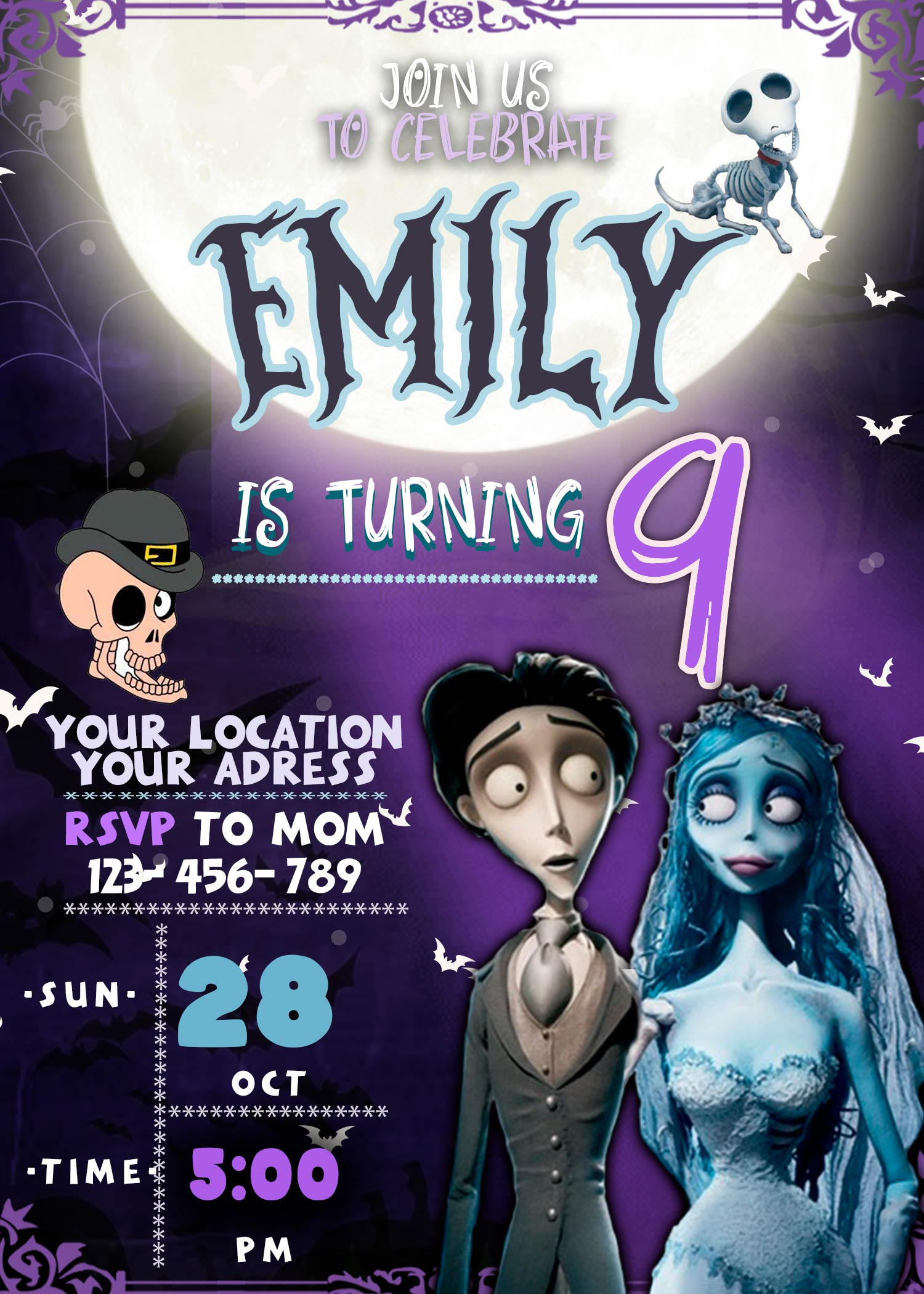 Halloween is all about a night full of fun and horror. Whether you’re hosting a spooky birthday party or sending out invites for trick-or-treating, our Corpse Bride Halloween Birthday Party Invite sets the perfect tone.