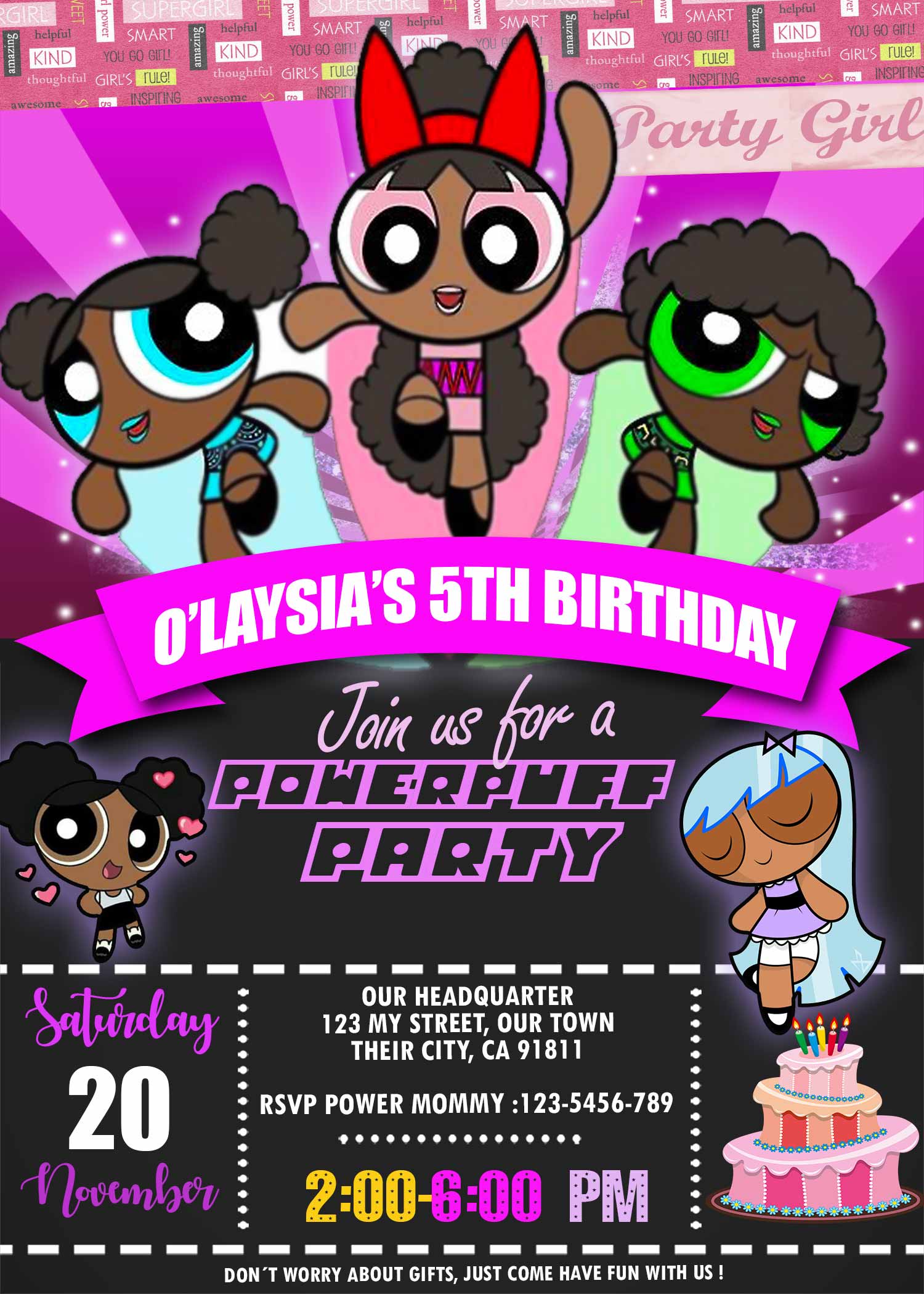 Incredible Powerpuff Black Girls Birthday Invitation. POWERPUFF BLACK GIRLS BIRTHDAY INVITATION PRINTABLE DIGITAL FILE This product is for one Powerpuff Black Girls Birthday Party, printable and digital file that will be send to your email after your purchase. As depicted in the opening sequence of each episode, the Powerpuff Girls Blossom, Bubbles, and Buttercup were created by […]