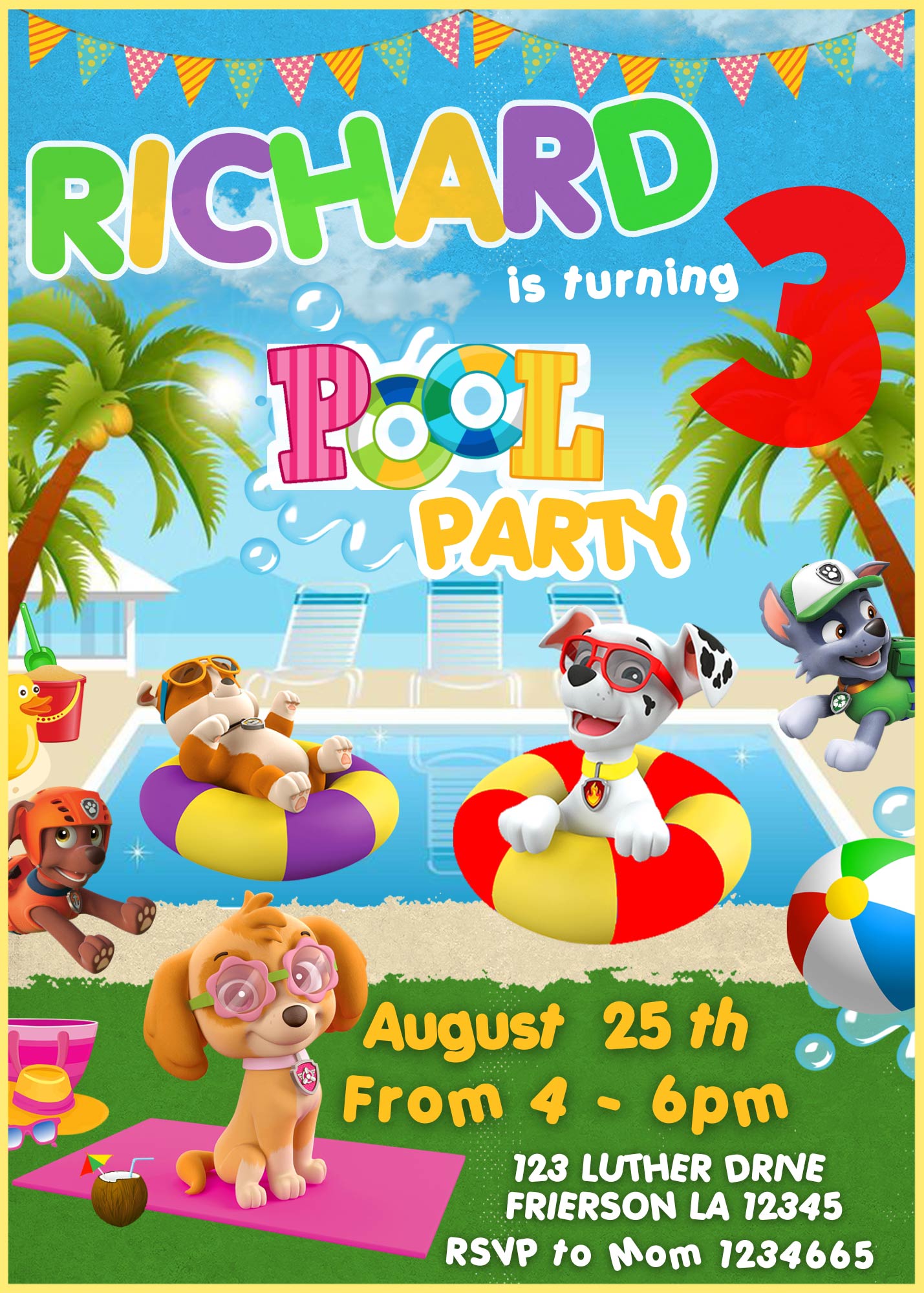 This is a digital, Paw Patrol Pool Party Invitation Template.