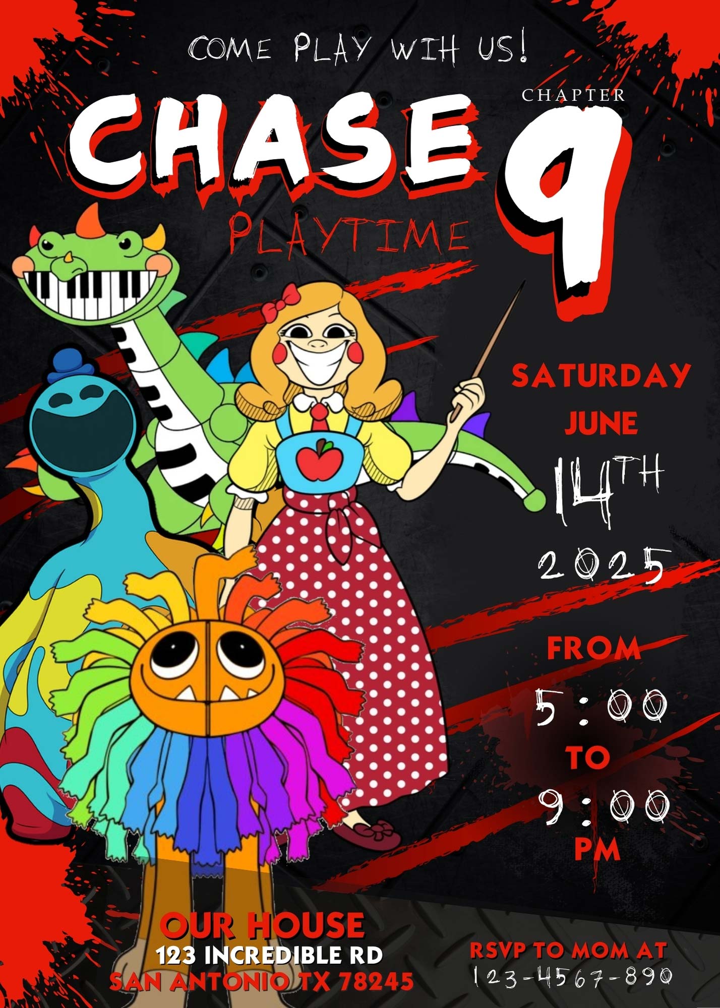 Come into adventure with our Poppy Playtime Chatper 4th Birthday Invitation Design! Perfect for fans of the amazing puzzle Poppy Playtime game, this digital invitation brings silly and imaginative adventures right to your child’s special day.