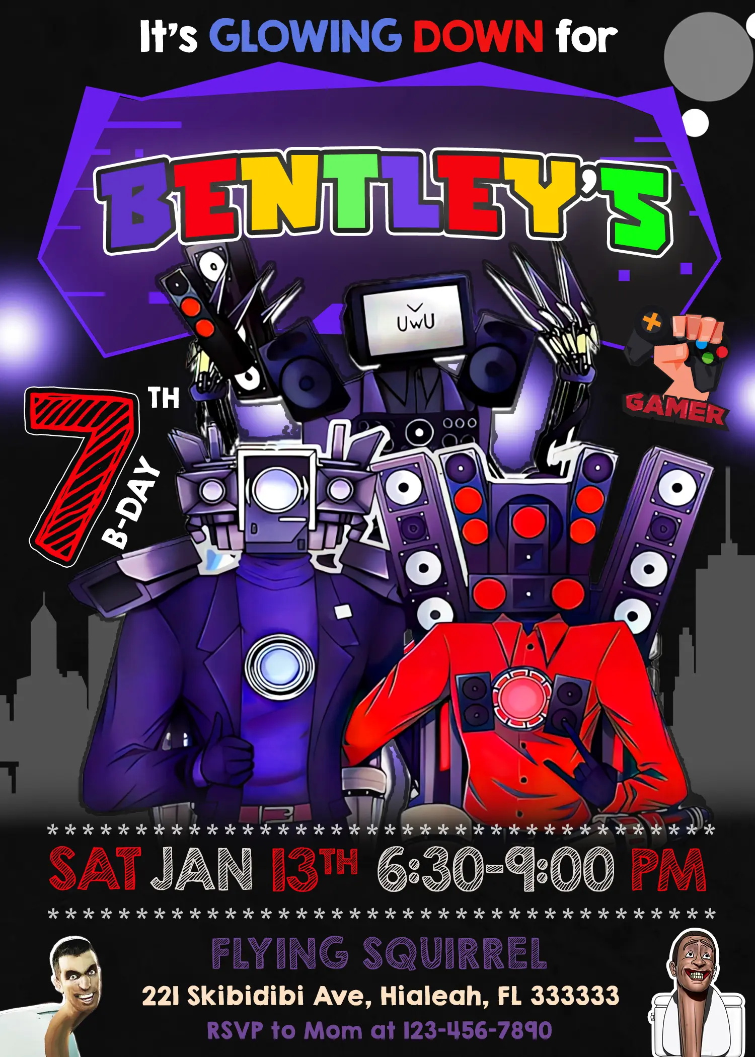 This is a digital, printable Skibidi Toilet Birthday Invitation. the invitation will be personalized by a professional designer after your purchase, using the info that you wrote at the buyers note when checking out.