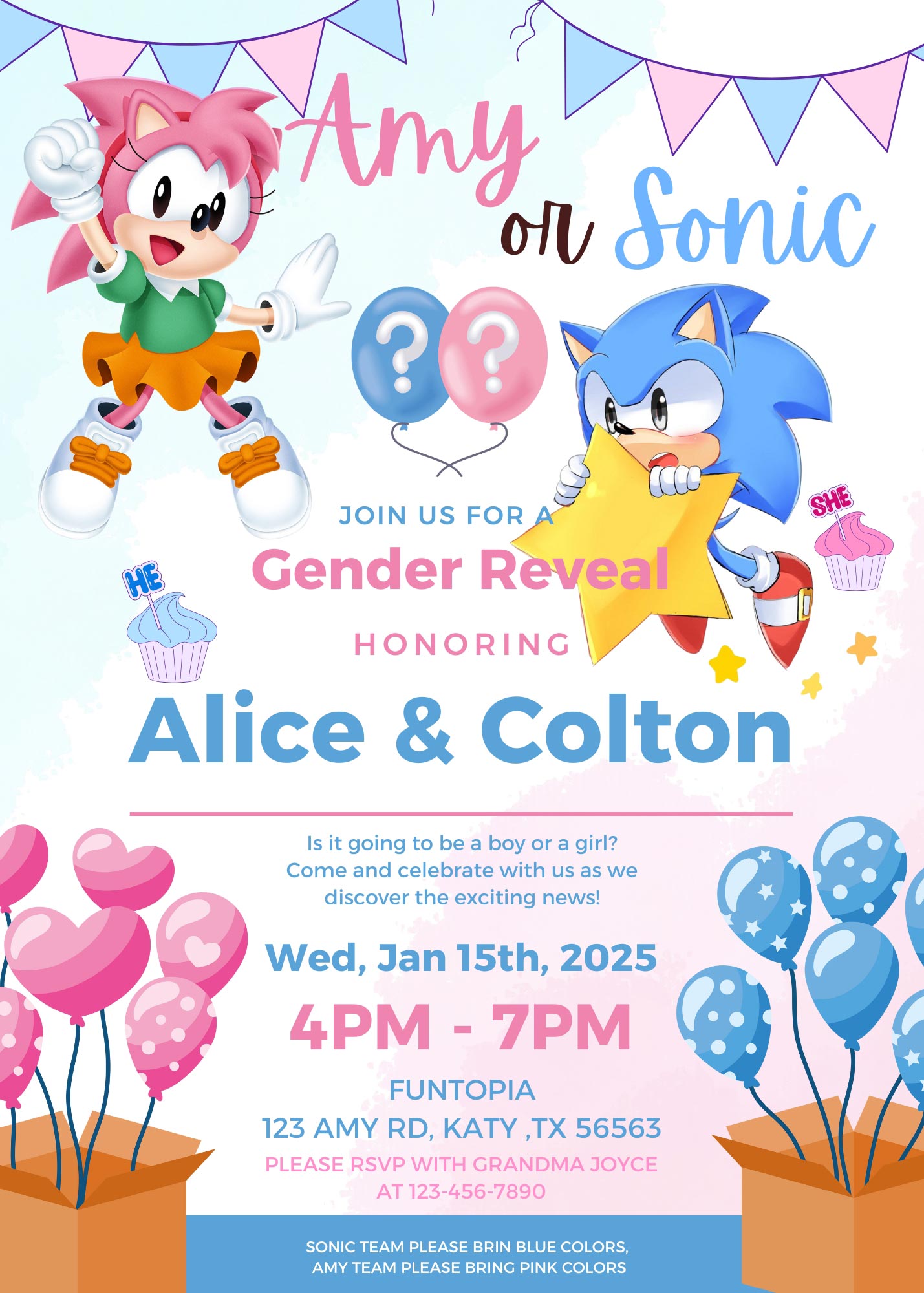 Beautiful Gender Reveal invitation you can use for inviting to your Sonic or Amy party theme celebration