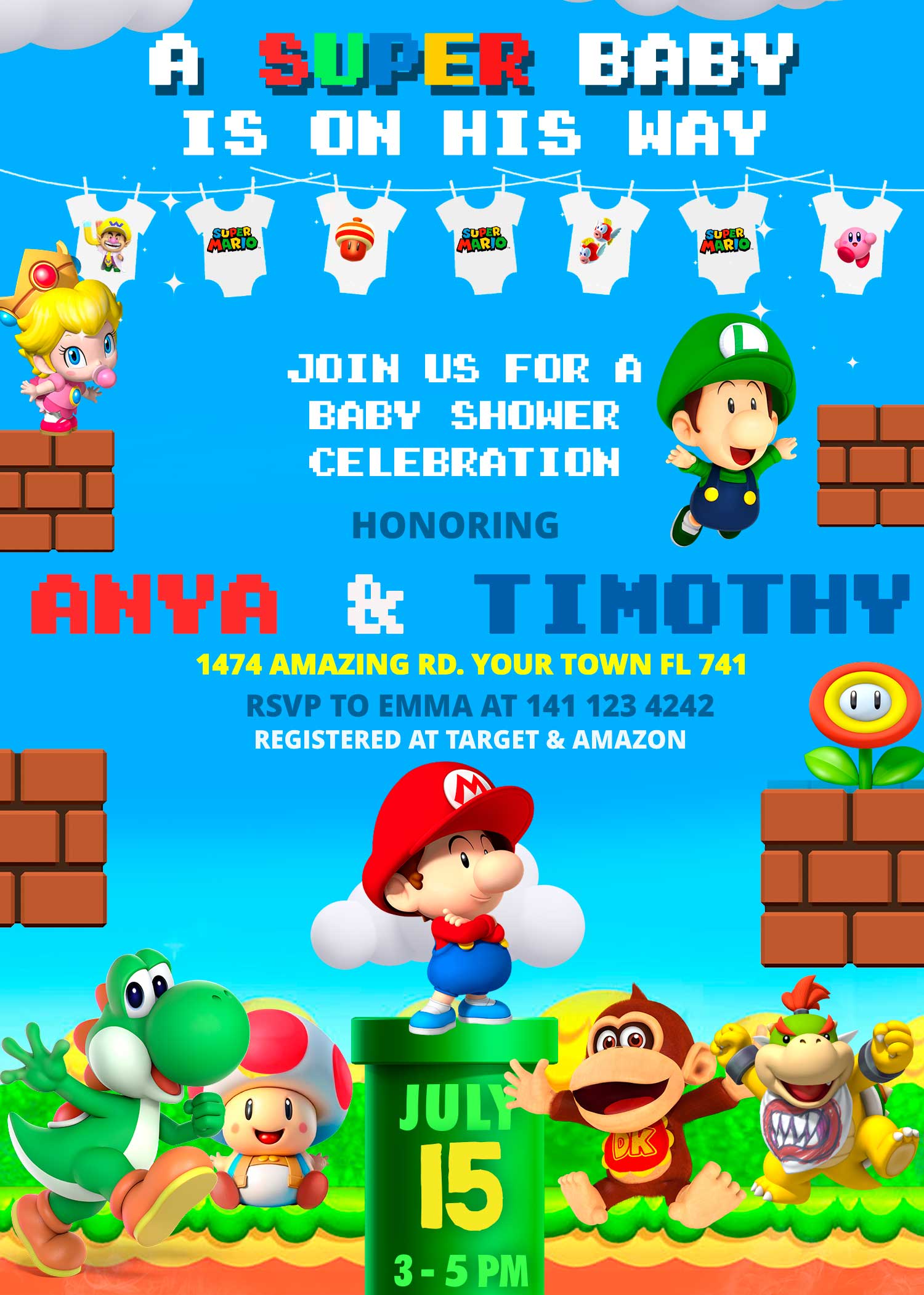 Delight your guests with an amazing baby shower party theme using these beautiful Super Mario Baby Shower Invitation.
