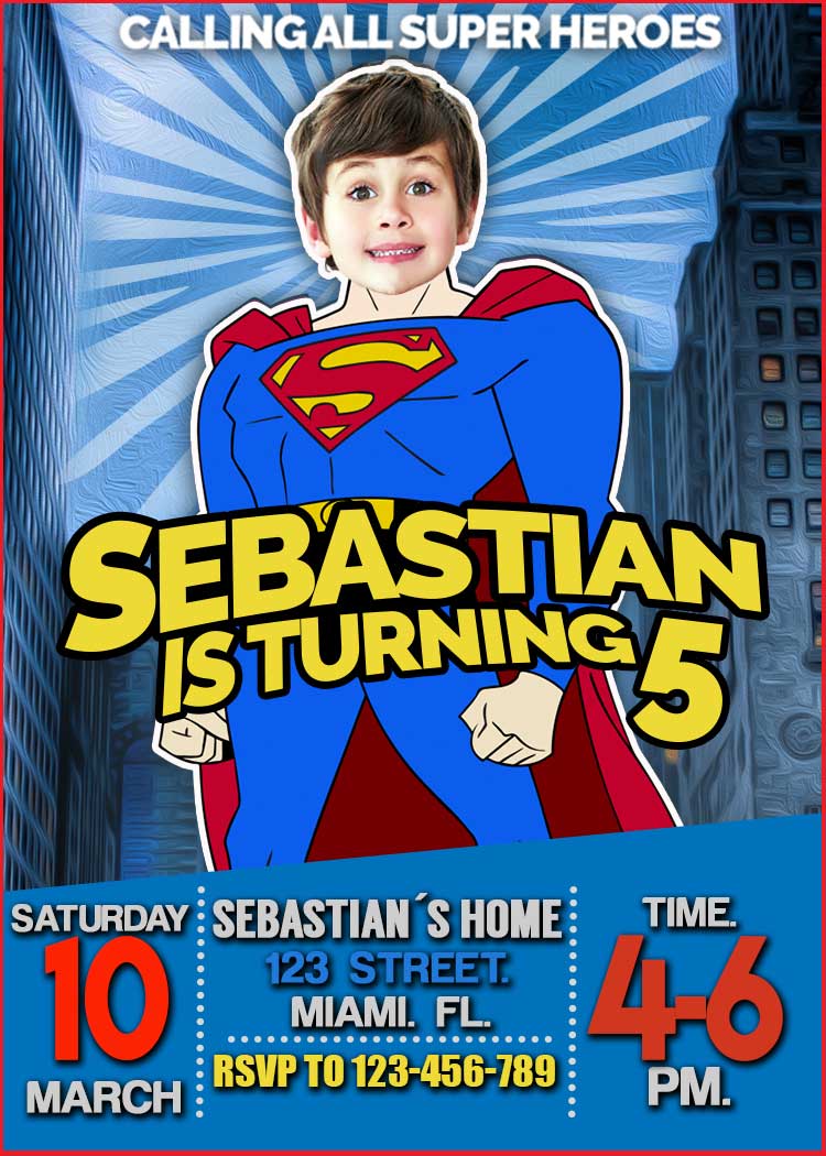 This product is for one Superman Costume Birthday Invitation, printable and digital file that will be send to your email after your purchase.